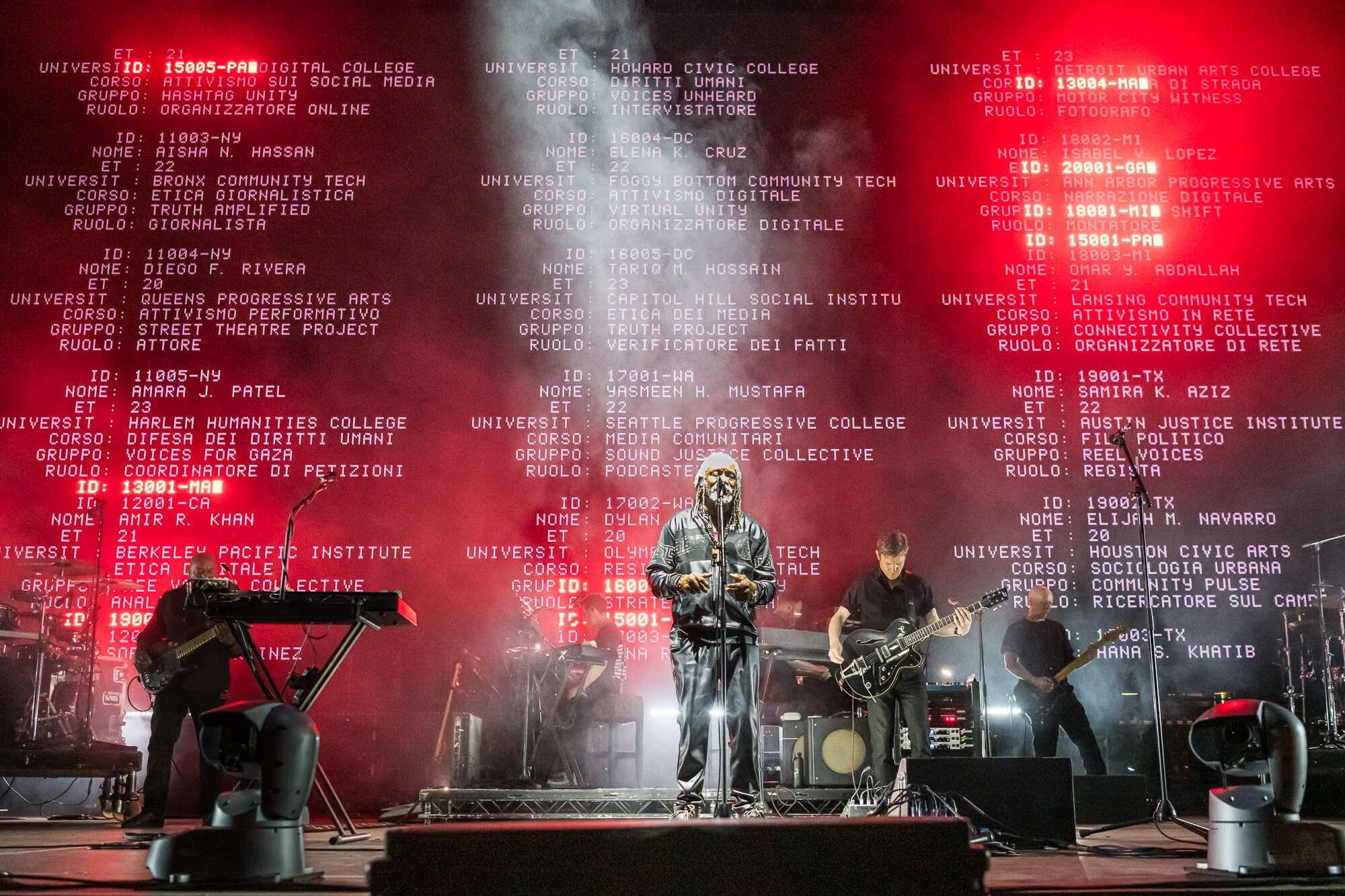 Il concerto dei Massive Attack è entrato nel vivo dopo la proiezione di uno spot di Medici senza Frontiere. "Chi sei?", "Cos'è la realtà?", “La natura è caotica o ordinata?”, si sono chiesti aprendo il live Robert "3D" Del Naja e Grant "Daddy G" Marshall. E' seguita una sfilza di titoli che avevano a che fare con nomi di musicisti e star di Hollywood, ma che non riguardavano la loro arte: erano riferimenti a vicende personali o gossip, che sfumavano il lettere e simboli casuali a sottolinearne tutta l'inconsistenza. Poi un attacco diretto ai potenti (in primis Trump, Putin, Netanyahu e Musk con i suoi esperimenti per Neuralink) e agli offshore e come controllano la vita delle persone in maniera anche, a volte, inaspettata. Spazio alla guerra, prima quella in Ucraina ma soprattutto quella di Gaza. Un'enorme bandiera della Palestina ha campeggiato sullo schermo e poi si sono susseguiti nella loro nudità e crudezza i numeri impressionanti del conflitto: quanti morti, quante scuole e ospedali distrutti, quante bombe sganciate, quanti soldi spesi e finanziati dal governo britannico e americano. Un conteggio che sembra infinito, con cifre che sono già altissime e sono destinate ad aumentare.