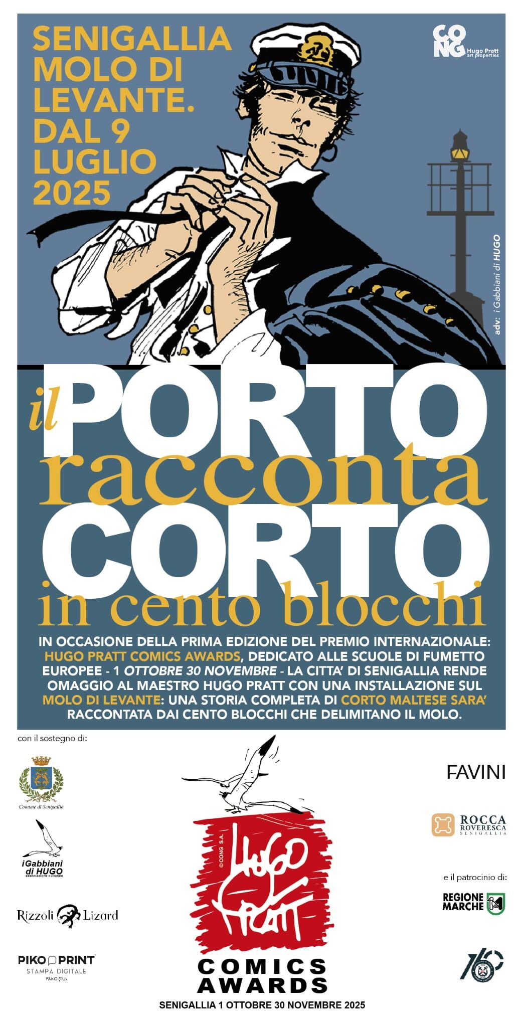 Corto Maltese approda a Senigallia. Il Molo di Levante, a partire dal 9 luglio, si trasforma in un percorso a cielo aperto dedicato al celebre marinaio creato da Hugo Pratt. Lungo i blocchi frangiflutti che costeggiano la foce del fiume Misa, prenderà forma l'installazione urbana "Il porto racconta Corto in 100 blocchi", composta da 100 pannelli, ciascuno con una vignetta a colori tratta da Corte sconta detta arcana, la storica avventura pubblicata nel 1974 e riproposta quest'anno in versione integrale su AlterLinus.