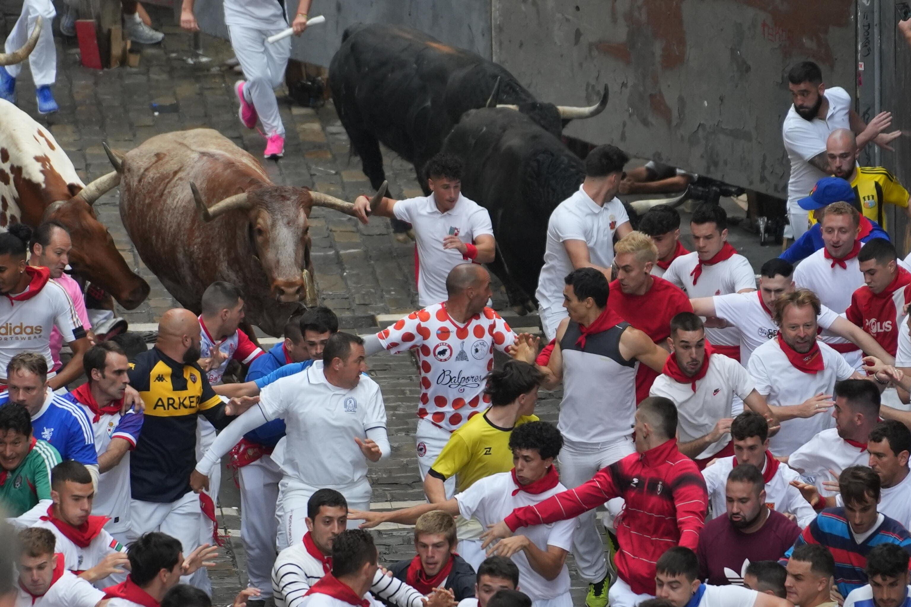 La prima corsa - Il bilancio della prima corsa è stato fornito dall'assessore alla Salute del Comune spagnolo. Non è chiaro se le ferite, a braccia e gambe, siano state causate dalle corna dei tori o da cadute nella calca. I media spagnoli riferiscono tuttavia che la corsa dei tori, provenienti dall'allevamento di Fuente Ymbro (Cadice), è stata rapida e "pulita". Migliaia di spettatori hanno assistito alla corsa dalle balconate e dalle barricate di legno lungo il percorso. Altri milioni hanno seguito lo spettacolo in diretta televisiva. Anche quest'anno, l'evento non è stato privo di detrattori: sabato 5 luglio, gli attivisti per i diritti degli animali hanno marciato per Pamplona indossando corna, e con macchie di sangue finto sulla pelle, per protestare contro le corse dei tori. Alcuni hanno esposto cartelli con la scritta "Le corride sono peccato".