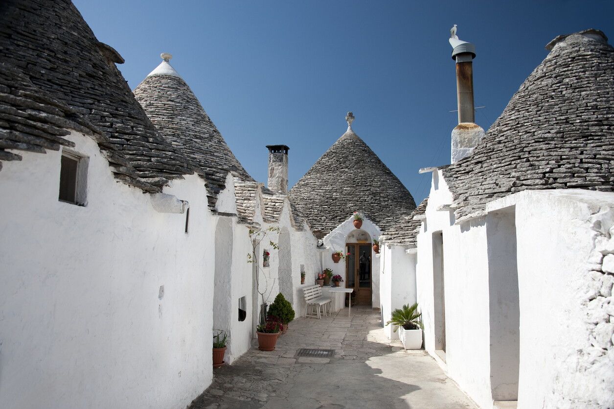 ALBEROBELLO – Valle D’Itria – È la famosa città dei Trulli, le antiche abitazioni agresti dal tetto a cono. La loro particolare conformazione risale al XV secolo: per evitare di pagare la tassa sugli insediamenti urbani, le case dei contadini erano costruite a secco, senza utilizzare malta, in modo che potessero essere giudicate precarie data la facilità con cui potevano crollare. E, in effetti, capitava spesso che gli stessi abitanti demolissero di proposito il caratteristico tetto a cono, costruito con cerchi di pietre sovrapposti, se compariva nel villaggio l’addetto alla riscossione dei tributi.