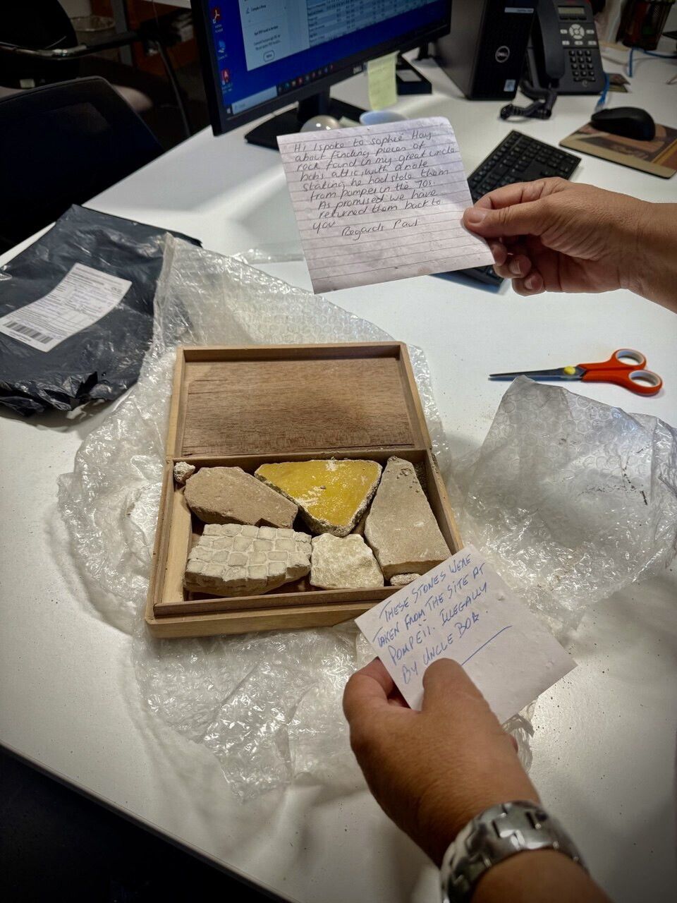 Ogni tanto a Pompei arrivano pacchetti contenenti reperti rubati dal sito archeologico, che i visitatori decidono di restituire via posta dopo anni. Alcuni temono infatti di restare vittime della cosiddetta "maledizione di Pompei", ossia quella "sfortuna" che - secondo la credenza popolare - colpisce chi trafuga oggetti dal Parco. E così, nei giorni scorsi, al sito storico è giunto l'ennesimo pacco, stavolta proveniente da Bolton, città del Regno Unito, con alcuni frammenti di intonaco. Il tutto accompagnato da un bigliettino scritto a mano: "Questi pezzi sono stati presi illegalmente dal sito di Pompei dallo zio Bob". Il mittente? Paul, pronipote dell'uomo.
