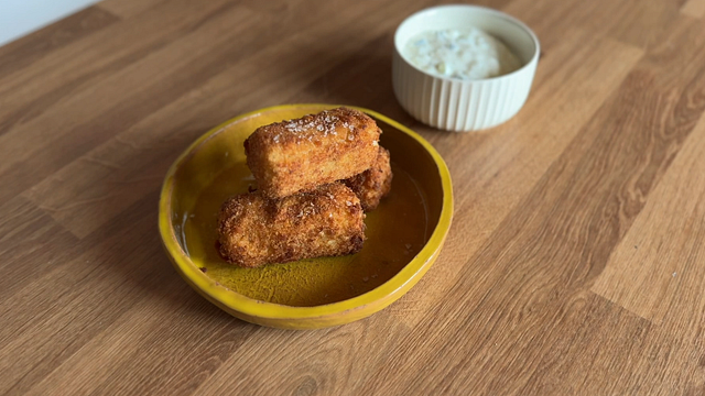Friggete i bastoncini in olio caldo finché non saranno dorati e croccanti. Scolateli su carta assorbente e aggiungete un pizzico di sale Maldon.