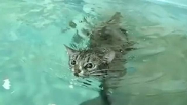 Accompagnato da un’istruttrice, Mog è alla sua decima lezione di nuoto in una vasca di poco meno di cinque metri. Ed è finalmente riuscito ad appoggiarsi sulle sue zampe.