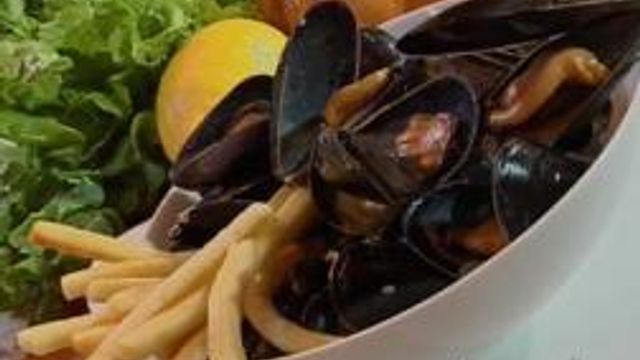 Ingredienti: una cipolla, olio d'oliva, 1 kg di cozze, 100 gr di formaggio roquefort, vino bianco, panna da cucina,patatine fritte.