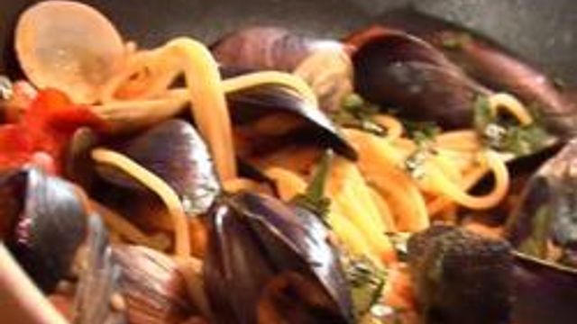 Lasciar riposare in abbondante acqua salata le vongole per minimo 30 minuti. Lavare le cozze sotto l’acqua corrente, togliendo l'impurità e la "barbettina". Far soffriggere l'aglio in poco olio, quindi aggiungere le vongole e le cozze e sfumare con poco vino bianco, cuocere a fiamma viva con il coperchio. In un altro tegame, far rosolare due spicchi d'aglio con un filo d'olio e cuocere i pomodori, poi unirli ai crostacei che, nel frattempo si saranno aperti. Cuocere gli spaghettini al dente e terminare la cottura facendoli saltare brevemente nel liquido di cottura dei frutti di mare. Aggiungere una generosa manciata di prezzemolo e peperoncino.... Et voilà, cotto e mangiato!