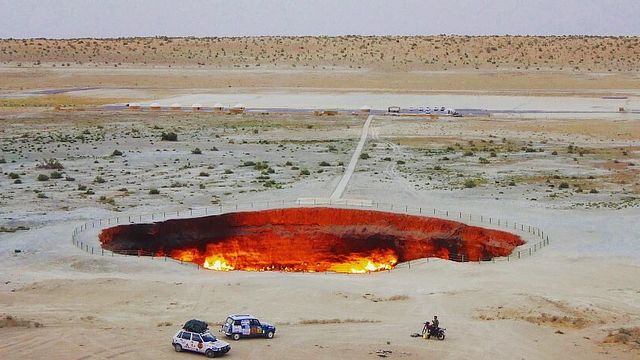 La Porta dell'inferno è un gigantesco cratere di 70 metri di diametro e 20 metri di profondità da cui, ormai dagli anni Settanta, si alzano fiamme senza sosta. La gigantesca voragine di fuoco si trova nel cuore del Turkmenistan, perfettamente a metà strada tra la capitale e la terza città più grande del Paese, Dashoguz. Attorno a lei tuttavia, c'è soprattutto sabbia. Nulla di così sorprendente, considerando che l'intera Nazione è occupata per tre quarti dal deserto del Karakum. Una zona quindi apparentemente vuota, che sembrerebbe condannare alla povertà i pochi che ci abitano se non fosse che, sotto tutta quella sabbia, si nascondono quei gas che sono il sostentamento dell'economia turkmena e che in passato sono stati il vero motivo per cui i sovietici si coccolavano questo avamposto nell'Asia Centrale, grande più di una volta e mezzo l’Italia ma con un dodicesimo della sua popolazione (poco più di 5 milioni di abitanti). Proprio all'URSS e alla sua voglia di scoprire i giacimenti nascosti del Turkmenistan si deve non a caso anche la nascita involontaria della Porta dell'inferno, creata per errore nel 1971.