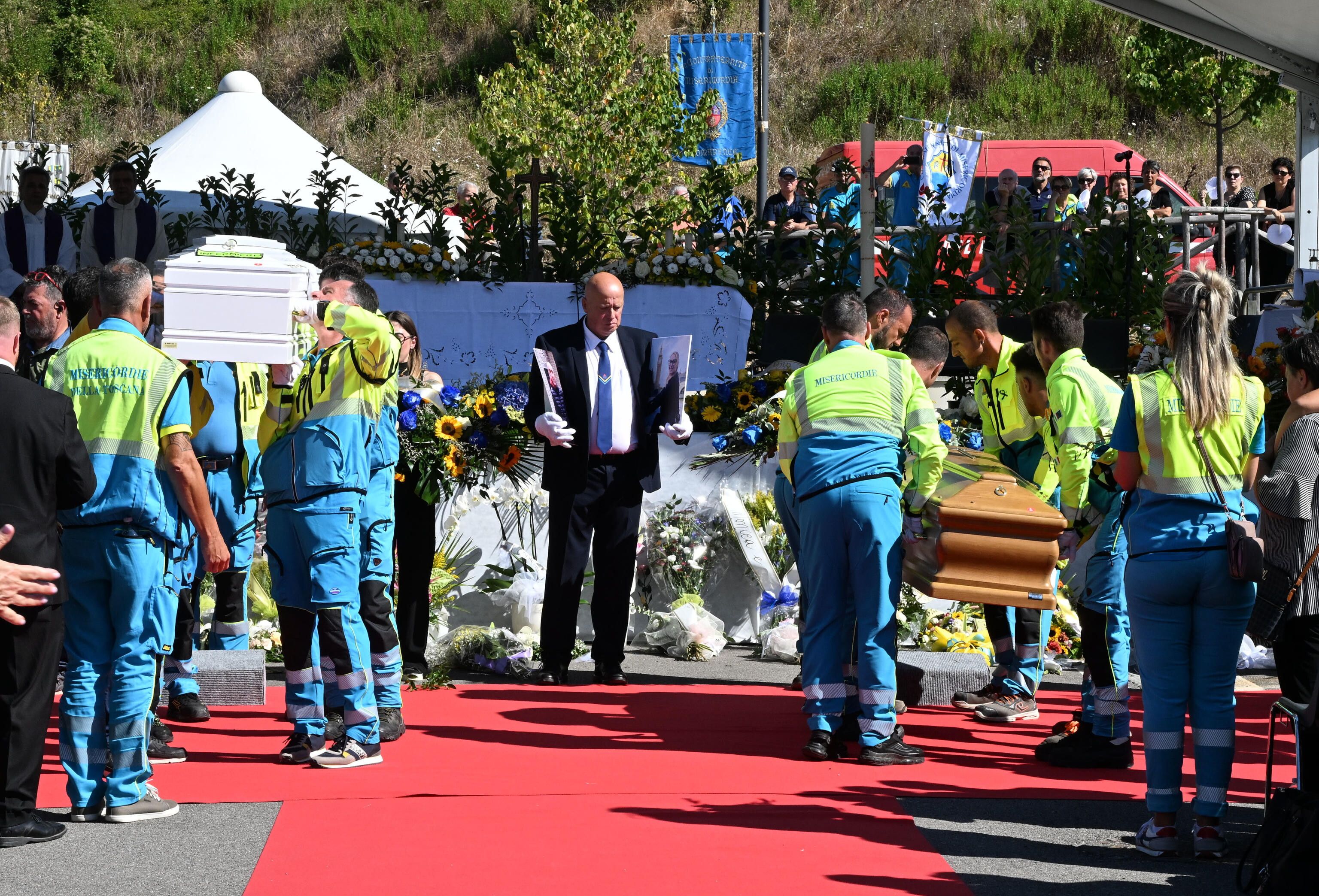 La cerimonia in piazza, alla quale hanno partecipato commosse almeno 2.500 persone, è iniziata alle 10, ed è stata celebrata dal vescovo di Arezzo Andrea Migliavacca, affiancato dal correttore nazionale delle Misericordie, don Franco Agostinelli. È stato letto anche un messaggio che il cardinale Pietro Parolin ha inviato a Migliavacca col cordoglio e la "spirituale vicinanza" di Papa Leone XIV ai familiari: "In tale momento di particolare dolore, il Pontefice, mentre ricorda il generoso impegno di quanti offrono la propria opera nei confronti dei fratelli bisognosi sull'esempio del buon samaritano del Vangelo, implora il conforto della fede per i congiunti invocando al Signore pronta guarigione per i feriti".