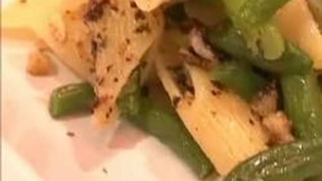 Lessare i pennoni insieme ai fagiolini tagliati più o meno della stessa lunghezza. Nel frattempo frullare il pane e tostare le briciole in padella. Appena incominciano ad abbrustolire, sfumarle con l’aceto balsamico. Trasferire in un piatto e far rosolare nella stessa padella due spicchi d’aglio schiacciati con abbondante olio. Scolare pasta e fagiolini e farli saltare in padella. Aggiungere le briciole di pane e, a fuoco spento, il provolone grattugiato.