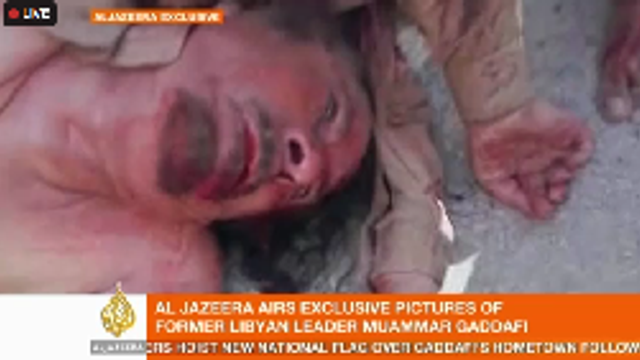 Il fermo immagine del corpo senza vita di Gheddafi sta scorrendo sulle emittenti arabe Al Jazeera e Al Arabyia, che precisano però di non poterne verificare l'autenticità. Quello che si vede è un uomo molto somigliante a Gheddafi, privo di sensi, con parte del volto coperto di sangue.