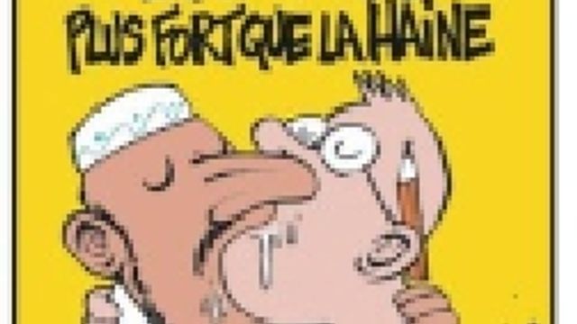 “L’amore è più forte dell’odio” recita una scritta che campeggia sull’immagine di un uomo in piena tenuta islamica che bacia appassionatamente un vignettista. Dopo la riapertura del servizio abbonamenti da parte del settimanale, dopo le manifestazioni di sostegno che il popolo gli ha tributato, dopo l’aiuto offerto da Liberation che ha messo a disposizione la redazione dunque, Charlie Hebdo invece di adottare una linea più soft ha deciso di alzare il tiro. Dietro ai due personaggi in copertina, fa notare il ‘Guardian’, ci sono infatti le ceneri degli uffici di Charlie, distrutti dall’attacco bomba dell’estremismo islamico e inoltre, sottolinea il Nouvel Observateur, la copertina “affronta una delle tematiche più critiche del pensiero islamico: l’omosessualità”.
