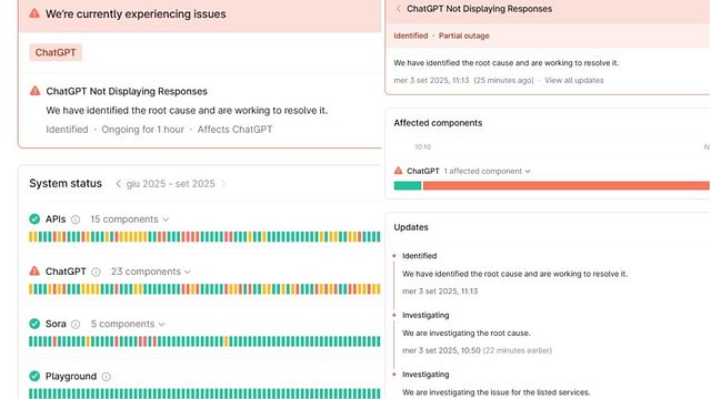 Le prime difficoltà sono state segnalate nelle ore centrali del mattino, con errori visibili già all'apertura della piattaforma. In molti casi, il messaggio "ChatGPT Not Displaying Responses" compariva sullo schermo impedendo al sistema di generare risposte. A differenza di disservizi parziali precedenti, quello del 3 settembre ha coinvolto tutte le principali funzionalità, sia nella versione gratuita che in quella Plus. Gli utenti non riuscivano né a interagire con il chatbot né a recuperare le conversazioni precedenti. Il malfunzionamento ha colpito anche l'interfaccia API, utilizzata da aziende e sviluppatori.