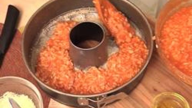 Ingredienti: mezzo pacco di riso, una passata di pomodoro, 400 g. di pancetta affumicata, tre uova, re cucchiai di parmigiano grattugiato, burro o olio, sale e pan grattato q.b.