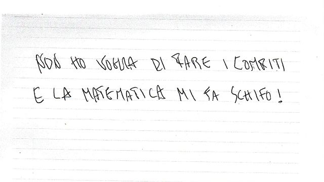 I tremolii e le stentatezze, che si ritrovano qua e là nello scritto, segnalano una insoddisfazione di base, ma spesso anche una rabbia esistenziale. Il mondo circostante gli appare ostile e nemico. La rovesciata a sinistra (cioè la pendenza verso il lato sinistro del foglio) indica che il ragazzo non si sente capito e per questo se la prende con gli altri. Vuole essere al centro delle attenzioni, primeggiare e quindi cerca la provocazione o reagisce in maniera aggressiva alle osservazioni altrui. Ovviamente è l'insieme di questi segni, non uno solo, che può far scattare un allarme nei genitori. A quel punto è fondamentale cercare comunque un dialogo e far sentire quell'affetto e quella considerazione che in fondo sta cercando.