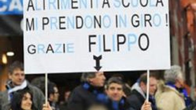 Filippo ha 9 anni e frequenta la quarta elementare. Caschetto biondo, il disappunto disegnato sul volto mentre l'Inter perdeva contro il Bologna, le mani a sostegno del cartello dove con garbo esortava i giocatori nerazzurri cosi': 'Potete vincere altrimenti a scuola mi prendono in giro? Grazie!'. A seguire la sua firma, il tutto realizzato in caratteri alternati neri e azzurri.