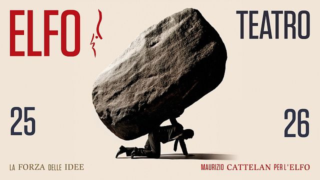 Il Teatro Elfo Puccini di Milano ha scelto "La forza delle idee" come tema per la stagione 2025-2026, che è una risorsa che la complessità del mondo presente richiede di attivare. A illustrare il senso è l'immagine che l'artista Maurizio Cattelan ha regalato al teatro: un uomo in ginocchio che tiene un gigantesco masso sopra di sé.