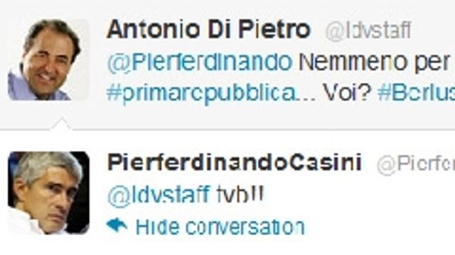 "C'è bisogno di pacificare la politica, anche Tonino!". Così "twittava" domenica pomeriggio Pier Ferdinando Casini, riferendosi evidentemente a Di Pietro. E il leader Idv, che ha intercettato il tweet, preferendo non rispondere ha "cinguettato" che in Parlamento così tanti lobbisti non c'erano neanche con Berlusconi. Replica: non rimpiangerai Silvio? "No". E il leader Udc, con il suo "Tvb", ("ti voglio bene"), scatena i commenti e gli sfottò della Rete.