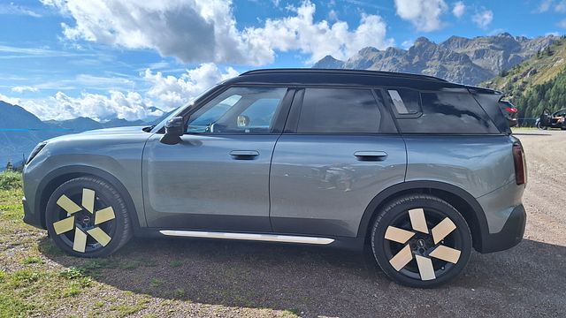 Il nostro test drive ha visto la Countryman protagonista tra gli stretti tornanti dell'Alta Val Brembana, nella bergamasca, dove la SE All4 se l'è cavata alla grande, senza mai togliere quel piacere di guida che gli appassionati del brand pretendono da una Mini, che sia essa dotata di un motore endotermico oppure - anzi, a maggior ragione - di un powertrain elettrico. In questo caso, la Coutryman per rispettare la tradizione anche un po' off-road di questo modello, di motori elettrici ne ha due, uno per asse, per complessivi 230 kW/313 CV e una coppia di 494 Nm, da godersi soprattutto nel misto. L'accelerazione è bruciante, con un 0/100 km/h staccato in appena in 5,6 secondi e una velocità massima, autolimitata, di 180 km/h. Grinta da vendere, quindi, e massimo controllo. A cui si aggiungono le funzioni estese dell'assistenza alla guida, parzialmente automatizzata e di livello 2, così come l'autonomia elettrica dichiarata che si spinge fino 433 chilometri secondo il ciclo di prova Wltp. La batteria vanta una capacità di ben 66,45 kWh. Tempi e modi di ricarica possono essere gestiti comodamente anche da un'app. Il tempo di ricarica in DC (potenza massima 130 kW) va dal 10 all’80% in soli 29minuti. Durante la nostra prova abbiamo davvero esasperato la durata della batteria. A velocità di codice in autostrada e soprattutto arrampicandoci tra i tornanti del Monte Avaro, i km restanti sul display scendono quasi "a vista d'occhio" e ci si ritrova col cuore in gola. In compenso, la capacità di rigenerazione in discesa è veramente portentosa. La Countryman riesce a recuperare decine e decine di chilometri di autonomia facendoci dimenticare l'ansia provata in salita.