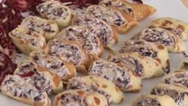 Prepariamo le crêpes: in 40 gr. di farina mettiamo 125 ml di latte, un uovo, un pizzico di sale ed amalgamiamo bene il tutto. In una padella facciamo rosolare uno spicchio d'aglio e del radicchio tagliato finemente, un pizzico di sale e pepe e lasciamo raffreddare. Cuociamo la pastella precedentemente preparata: scaldiamo la padella con un goccio d'olio e versiamo il composto. Uniamo al radicchio raffreddato 200 gr. di ricotta fresca, aggiungiamo 25 gr. di mandorle tostate per 5 min. in forno a 160°. Mescoliamo le mandorle tritate al nostro ripieno e farciamo le crêpes. Ripieno e mangiato!