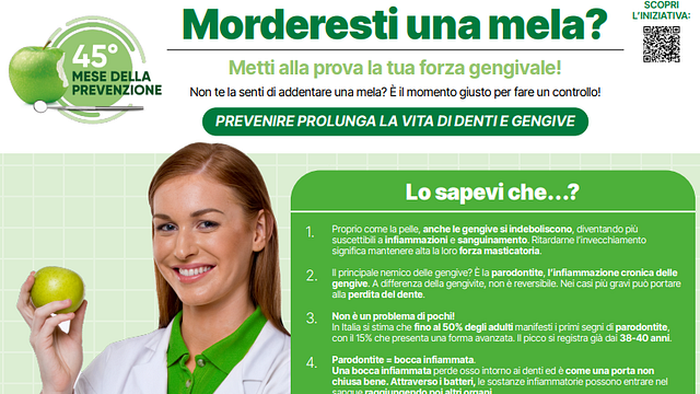 Un italiano su tre (32%) non si sente sicuro nel mordere una mela. Un gesto simbolico, ma anche concreto, che accende i riflettori su un aspetto spesso sottovalutato della salute orale: la forza gengivale. Eppure, davanti a gengive che sanguinano, solo una persona su tre (30%) prenoterebbe una visita dal dentista. In confronto, il 60% lo farebbe per una carie, e il 46% per placca o tartaro. A rivelarlo, una ricerca condotta da Ipsos in occasione del 45° anniversario del Mese della Prevenzione Dentale. Promosso da ANDI – Associazione Nazionale Dentisti Italiani e Mentadent, da oltre quattro decenni promuove la diffusione della cultura dell'igiene e della salute orale con la partecipazione di oltre 10mila dentisti volontari che ogni anno si mettono a disposizione.
