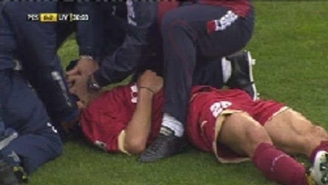 Un'azione offensiva del Pescara, la corsa lontano dal pallone, e poi improvviso il crollo a terra sul vertice della propria area: è la terribile scena di cui è stato protagonista al trentunesimo il centrocampista del Livorno. Il giocatore è caduto in avanti, faccia a terra, apparrentemente in preda a convulsioni, e immediatamente le due panchine e il guardalinee hanno attirato l'attenzione dell'arbitro Baratta che ha fermato il gioco. I medici hanno soccorso Morosini usando un defibrillatore.