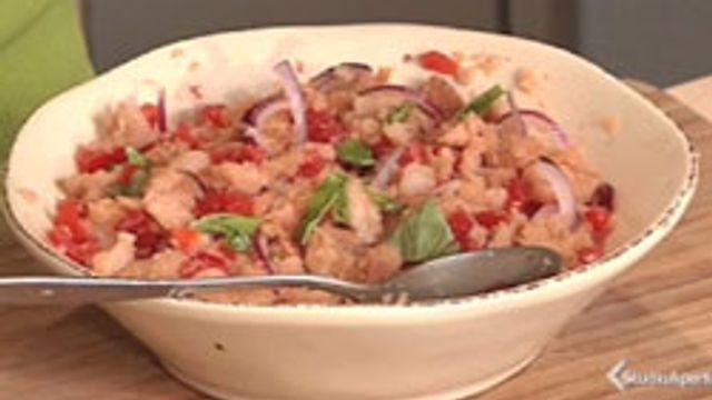 Ingredienti per 4 persone: 4 friselle o fette di pane toscano, 500 gr di pomodori maturi bio, ½ cipolla rossa, olio, basilico.