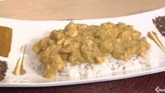 Ingredienti: 500 g di pollo (a fette o intero), 2 cipolle bianche grosse, 400 ml latte di cocco q.b. (in latta) 250 gr. Riso basmati,5g curry, farina, olio