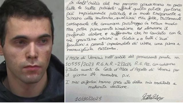 Nella lettera protocollata nel carcere di Montorio e resa nota da Il Gazzettino e dai quotidiani Nem, Turetta scrive di essere "tristemente consapevole che comunque purtroppo in nessun modo essa possa pienamente rimediare ed eliminare il profondo dolore e sofferenza che ho causato con le mie gravissime azioni a Giulia e a tutti i suoi familiari e parenti, impedendole di vivere una piena e meravigliosa esistenza". "Sinceramente dal profondo del cuore, pensando a lei e a tutto questo, ho preso la scelta di rifiutare di affrontare i successivi gradi di giudizio e accettare la pena che ho ricevuto in primo grado", precisa.
