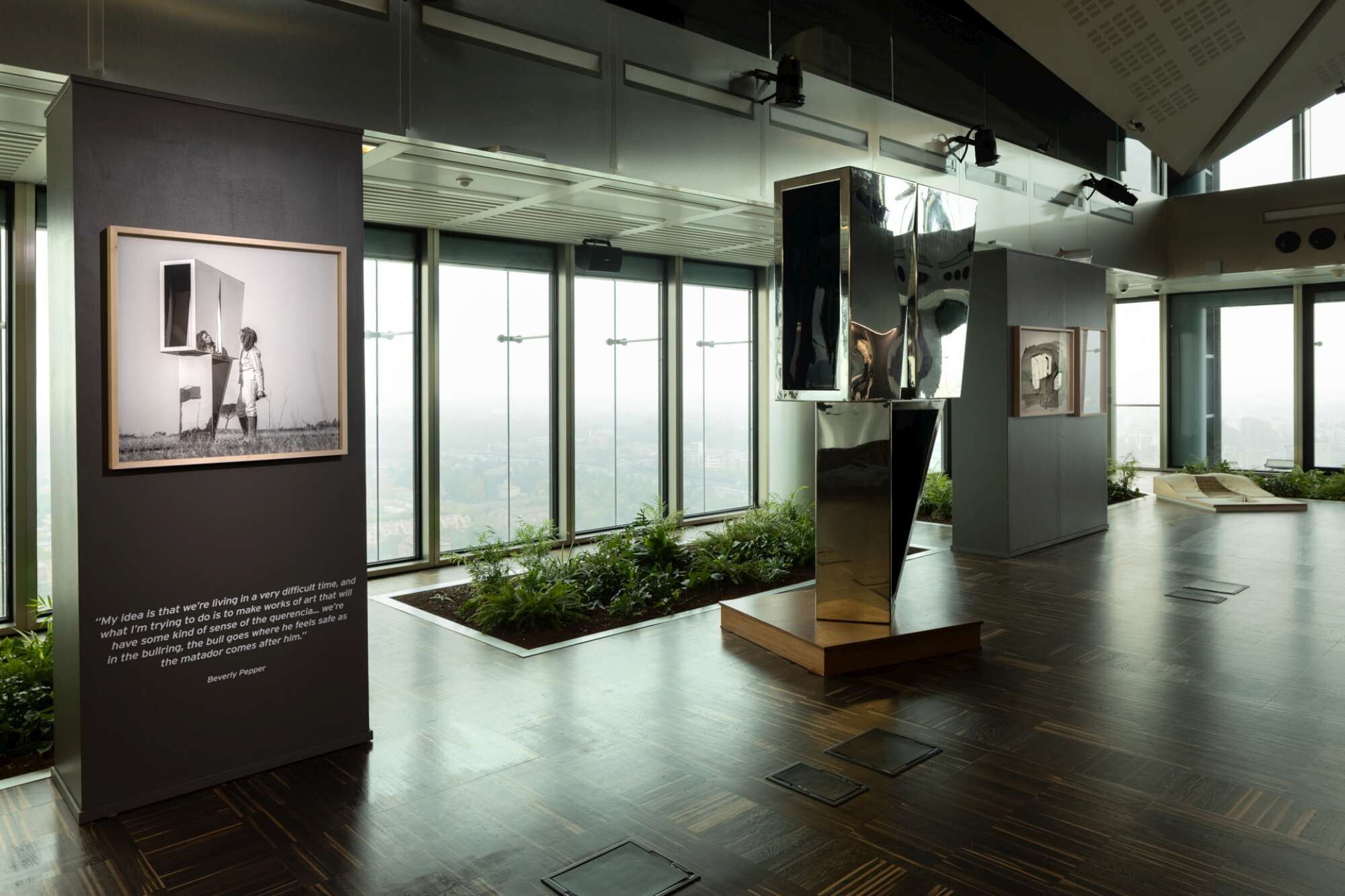 Quella che CUBO ha dedicato a Beverly Pepper è una mostra d'archivio che rilegge l'opera dell'artista ripercorrendone le tappe. A cura di Ilaria Bignotti e Marco Tonelli e in collaborazione con la Fondazione Progetti Beverly Pepper di Todi, propone un viaggio attraverso forme, materiali e idee che continuano a dialogare con le sfide del presente, invitandoci a riscoprire il senso di appartenenza e la connessione tra esseri umani, natura e ambiente urbano. Il fulcro sono le due opere monumentali parte del patrimonio artistico del Gruppo Unipol: Prisms, che troneggia nella sede espositiva di Porta Europa, e Virgo Rectangle Twist, che inquadra il paesaggio dalle vetrate della Torre. Sono due opere fondamentali per Beverly Pepper, che inizia a ragionare sull’opera pubblica come principio e motore di inclusione, coinvolgimento, condivisione, luogo di esperienza. A queste sono associati disegni di progetti ambientali e disegni progettuali delle medesime sculture che però sembrano opere a sé stanti: ricchi di colori, emozioni, dettagli che raccontano il pensiero dell'artista. "A dimostrazione di quel continuo fluire di scala e di pensiero che la scultrice sapeva tradurre in opere plastiche e in grandi interventi" scrive la curatrice Ilaria Bignotti nel testo in catalogo.