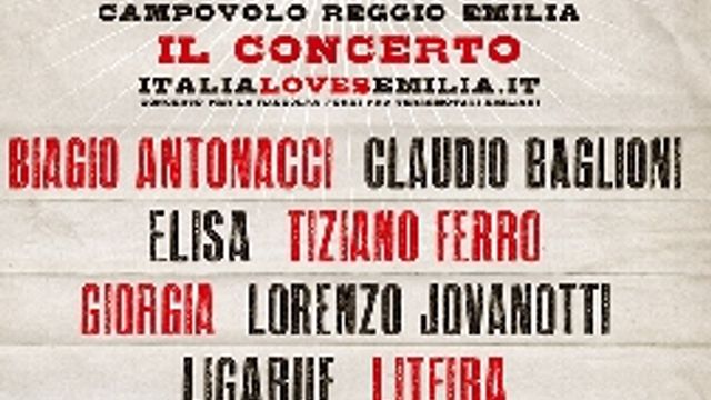Nei giorni immediatamente successivi agli eventi sismici che a maggio hanno colpito la popolazione dell’Emilia Romagna, 14 big della musica italiana hanno deciso di dare il loro sostegno con un grande e significativo concerto "Italia Loves Emilia" che si svolgerà il 22 settembre al Campovolo di Reggio Emilia. Antonacci, Baglioni, Elisa, Ferro, Giorgia, Lorenzo Jovanotti, Ligabue, Litfiba, Fiorella Mannoia, Negramaro, Nomadi, Laura Pausini, Zero e Zucchero, questi i grandi artisti che hanno deciso di esprimere solidarietà alla popolazione colpita dal sisma e di aiutare la raccolta dei fondi per la ricostruzione.