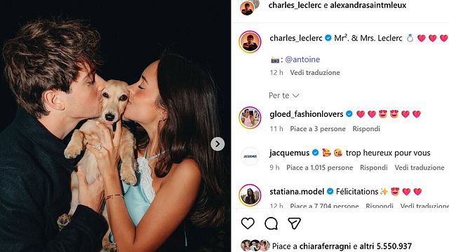 Charles Leclerc matrimonio in arrivo! Il pilota monegasco della Ferrari ha sorpreso i fan con un annuncio romantico sui social. Il campione ha scritto “Mr. & Mrs. Leclerc” accompagnando la frase con l’emoji di un anello e alcune foto con la fidanzata Alexandra Saint Mleux, la giovane e affascinante influencer francese che ha conquistato il suo cuore. In pochi minuti, il post ha fatto il giro del web, ricevendo migliaia di like e commenti da parte dei tifosi e colleghi del mondo della Formula 1.