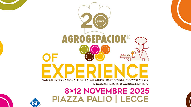 Dall'8 al 12 novembre 2025, al Centro Fiere di Lecce (Piazza Palio), torna Agrogepaciok, il Salone internazionale della gelateria, pasticceria, cioccolateria e dell'agroalimentare. Quest'anno la più grande fiera professionale del Sud Italia dedicata al food & beverage, si prepara a un'edizione speciale che segna 20 anni di eccellenza e passione: un appuntamento che unisce tradizione, innovazione e futuro del gusto, con cinque giornate per professionisti del settore e non solo, tra workshop, showcooking, laboratori e concorsi professionali in programma nei quattro Forum dedicati a Cucina, Pasticceria, Panificazione e Pizzeria. Tra le novità della ventesima edizione, la presenza di due eccellenze europee della formazione: A.P.E.I. (Ambasciatori Pasticceri dell'Eccellenza Italiana) del Maestro Iginio Massari e Accademia Niko Romito, Scuola di Alta formazione e Specializzazione professionale dello chef tre stelle Michelin.