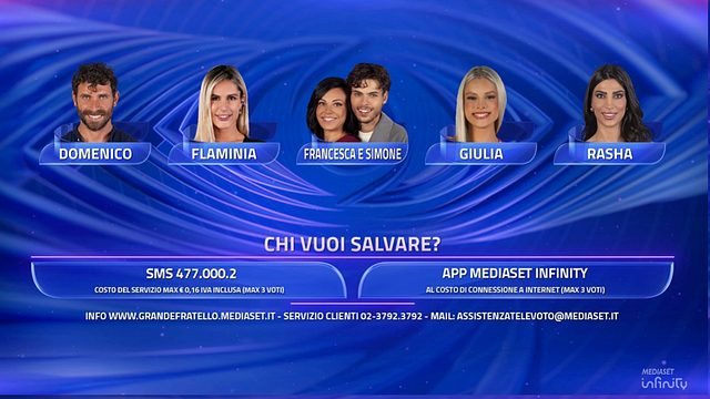 Il primo a finire a rischio eliminazione in vista della prossima puntata è stato Domenico, uscito battuto dal televoto che lo vedeva protagonista in questa puntata. Insieme a lui, i casalinghi e le casalinghe della casa hanno fatto i nomi di: Flaminia, Francesca e Simona, Giulia e Rasha. Al termine del televoto il concorrente meno votato sarà definitivamente eliminato dalla trasmissione e dovrà immediatamente abbandonare la Casa del "Grande Fratello".