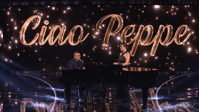 I due protagonisti della trasmissione hanno ricordato Vessicchio con un brano di Gino Paoli "Ti lascio una canzone", cantata al pianoforte da D'Alessio, mentre sullo sfondo la scritta dedicata al compositore: "Ciao Peppe".