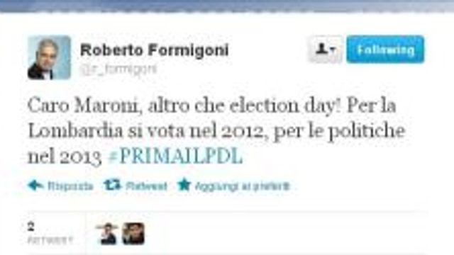 Ma poco dopo, il governatore lombardo, Roberto Formigoni, interviene via Twitter con un tono che non ammette repliche: "Caro Maroni, altro che election day! Per la Lombardia si vota nel 2012, per le politiche nel 2013".