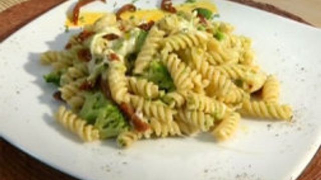 Ingredienti per 4 persone: 320 gr di fusilli, 100 gr di cime di broccoli, 100 gr di scamorza bianca a cubetti, 6-7 di pomodorini secchi, 1 spicchio di aglio, 4 cucchiai di olio extra vergine di oliva.