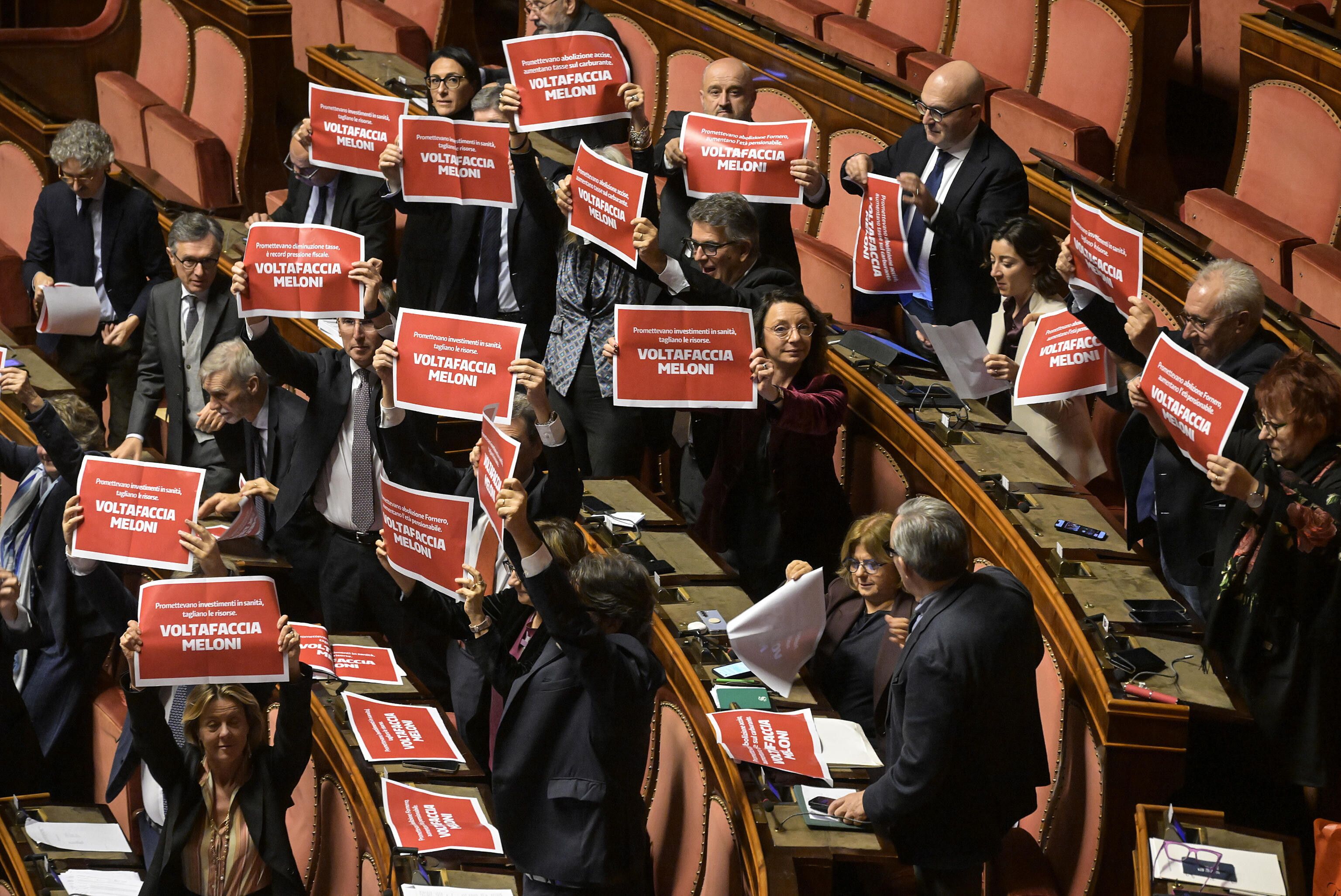 "Voltafaccia Meloni": questo si legge sui cartelli che si sono levati dai banchi delle opposizioni in Aula al Senato al termine delle dichiarazioni di voto sulla manovra. "Promettevano abolizione accise, aumentano tasse sul carburante", hanno scritto i senatori sui cartelli, "Promettevano abolizione Fornero, aumentano l'età pensionabile", "Promettevano investimenti in sanità, tagliano le risorse", "Promettevano diminuzione tasse, è record pressione fiscale", tutti con in evidenza la scritta "Voltafaccia Meloni".