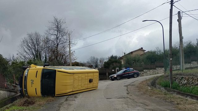 Uno scuolabus con a bordo sette bambini delle scuole Elementari di Cervaro, in provincia di Frosinone, fuori controllo, al termine di una ripida discesa si è ribaltato su un fianco a causa della forte velocità mentre affrontava una curva. I bambini sono stati fatti uscire rompendo il vetro posteriore. Stanno bene, sono solo molto spaventati. Uno di loro, in via precauzionale, è stato portato al Pronto Soccorso di Cassino perché mostrava un piccolo livido dopo avere battuto la testa. Sul posto sono intervenuti i carabinieri che stanno effettuando i rilievi per ricostruire l'esatta dinamica e le cause dell'incidente. I sospetti sono concentrati sulla forte discesa che potrebbe avere fatto surriscaldare i freni.