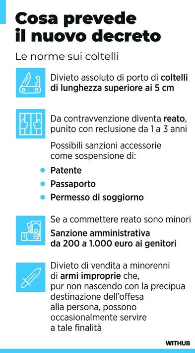 Tra le principali novità, c'è l'introduzione del divieto assoluto di porto di coltelli e lame, con la vendita ai minori che diventa proibita. Il riferimento, in particolare, è agli strumenti "con lama flessibile, acuminata e tagliente di lunghezza superiore a cinque centimetri, a scatto o a farfalla, di facile occultamento e di frequente utilizzo". Per chi va in giro con armi di questo genere la pena va da uno a tre anni di carcere. Previste anche aggravanti per chi viene sorpreso con il volto coperto o nei pressi di scuola, parchi, stazioni e metropolitane.