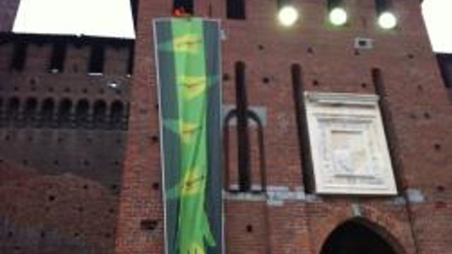 Un blitz di Greenpeace è stato messo in atto stamattina in centro a Milano, dove oggi comincia la settimana della moda. Cinque attivisti si sono introdotti nel Castello Sforzesco, sede centrale delle sfilate della fashion week, srotolando dal torrione del ponte levatoio uno striscione con l'immagine del "guanto di sfida" lanciato alla moda.