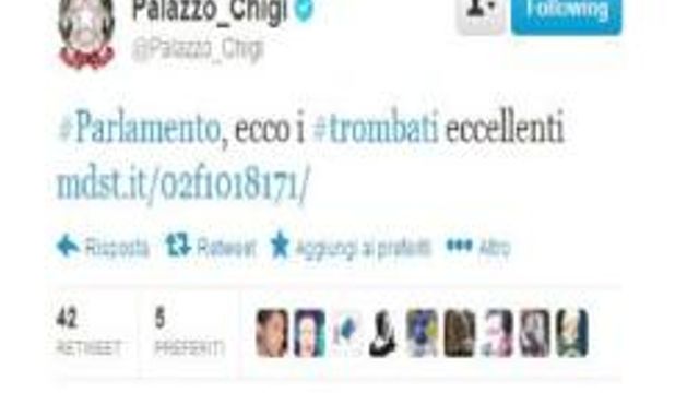 Gaffe e frettolosa retromarcia di Palazzo Chigi che pubblica sul proprio account ufficiale su Twitter un post poco "istituzionale": la photogallery di Tgcom24 sui "trombati" vip alla Camera. "Parlamento, ecco i trombati eccellenti http://mdst.it/02f1018171" è questo il tweet apparso e poi rimosso.