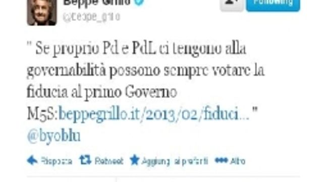 "Se proprio Pd e Pdl ci tengono alla governabilità, possono sempre votare, loro, la fiducia al primo governo targato M5S". Lo scrive Claudio Messora, spesso ospite sul blog di Beppe Grillo, sul sito del leader a cinque stelle, mettendo in guardia: "Cercate di non farvi fregare e rimettete, con lucidità, ogni tassello al suo posto". "Voi non potete votare chi si è reso corresponsabile dello stato in cui versa questo Paese", ha poi aggiunto.