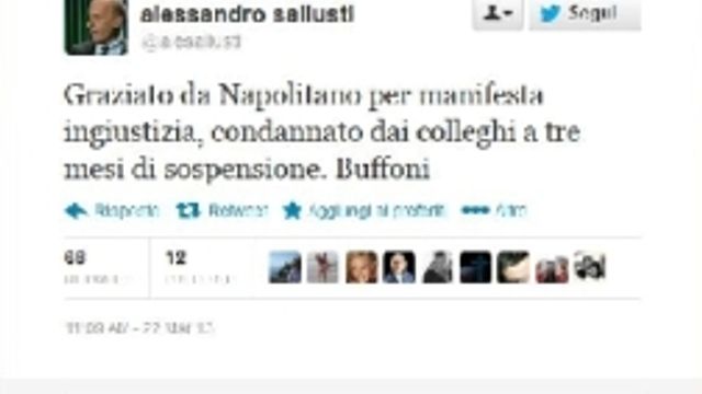Il Consiglio dell'Ordine della Lombardia ha sospeso per 3 mesi Alessandro Sallusti per gli articoli pubblicati su Libero, che all'epoca dirigeva, e che lo avevano portato all'arresto. La sentenza è sospesa per la presentazione di un eventuale appello al Consiglio nazionale dell'Ordine. "Graziato da Napolitano per manifesta ingiustizia, condannato dai colleghi a tre mesi di sospensione. Buffoni" ha commentato il giornalista su Twitter.