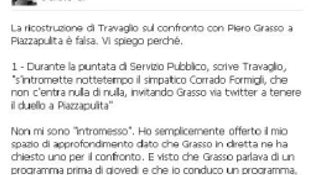 Nuovo capitolo della saga Travaglio-Grasso dopo l'accesa puntata di "Servizio pubblico" di giovedì 21 marzo. Stavolta a intervenire è il giornalista di La7 Corrado Formigli. Dalla sua pagina Facebook, l'ex figlioccio e allievo di Michele Santoro ribatte alle accuse mossegli stamattina da Travaglio, dalle pagine de "Il Fatto quotidiano". E scrive: "La ricostruzione di Travaglio sul confronto con Piero Grasso a Piazzapulita è falsa. Vi spiego perché".