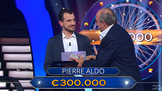 Pierre Aldo arriva dopo le scalate di Paolo da Bergamo, fermatosi alla cifra di 150mila euro, Cristiano da Milano, anche lui fermo alla stessa cifra e Lucia che, presa dall'emozione, si ferma soltanto alla terza domanda. Secondo il regolamento del programma, se un concorrente viene eliminato entro la terza domanda, viene ripescato il primo tra i concorrenti esclusi dalla manche a tempo. Così, tocca a Pierre Aldo, maresciallo dei carabinieri di Roma ma di origini svizzere. La sua scalata è fulminea e lo porta a leggere velocemente la domanda da 300 mila euro.