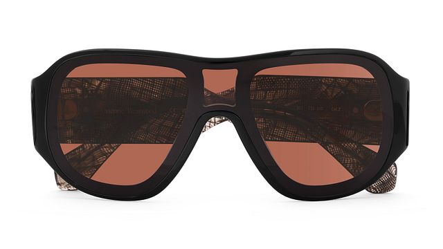 “Suki” è oversize e avvolge il volto. Disponibile in nero o con motivo web, è completato da sottili aste angolari impreziosite da un mini-charm orb.