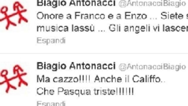 "Ma c...!!! Anche il Califfo. Che Pasqua triste!!'', è lo sfogo di Biagio Antonacci che poi twitta: "Onore a Franco e a Enzo, siete stati unici e diversi. Fate musica lassù... gli angeli vi lasceranno liberi".