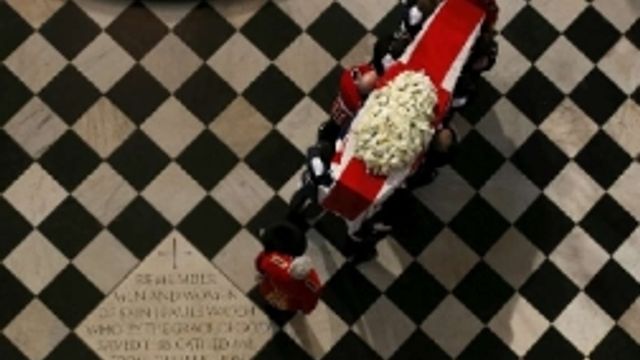 A conclusione del corteo funebre, la bara è stata portata a spalla per le scale dell'ingresso della cattedrale, nell'assoluto silenzio interrotto solo dal rintocco delle campane di St. Paul. Lungo il percorso del corteo, il passaggio del feretro è stato comunque segnato da applausi della folla, mentre fiori sono stati sparsi lungo la strada. Nella cattedrale oltre 2000 persone, circa 170 gli ospiti stranieri, tra cui alcuni capi di Stato e di governo.