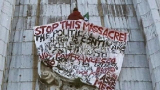 Si trova ancora sulla cupola della basilica di San Pietro Marcello Di Finizio, l'imprenditore triestino che lunedì è riuscito a salire esponendo uno striscione contro il "massacro" della crisi e contro l'euro. Di Finizio, che ha passato la notte sulla cupola, già a luglio e ottobre era riuscito nella stessa impresa per protestare contro una direttiva europea che, a suo dire, lo danneggerebbe.