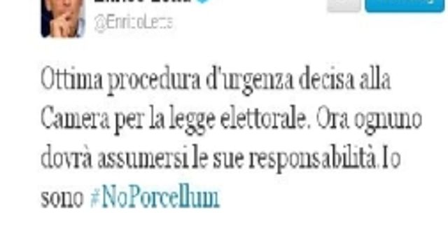 "Ottima la procedura d'urgenza decisa alla Camera per la legge elettorale". Lo ha scritto su Twitter il premier Enrico Letta. "Ora ognuno dovrà assumersi le sue responsabilità. Io sono 'NoPorcellum'", ha ribadito il presidente del Consiglio sul social network.