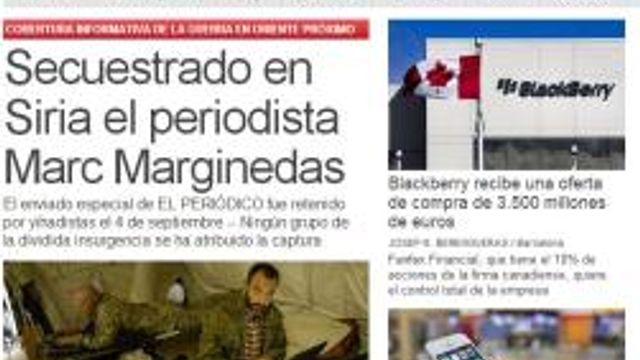 L'inviato speciale in Siria del quotidiano spagnolo El Periodico è stato rapito da un gruppo di ribelli. Lo annuncia lo stesso quotidiano online titolando: "Sequestrato in Siria il giornalista Marc Marginedas". Il reporter si trova nelle mani dei ribelli dal 4 settembre, giorno in cui ha avuto l'ultimo contatto con la redazione. Marginedas stava viaggiando in auto con il suo autista quando è stato fermato da alcuni jihadisti nei pressi di Hama.